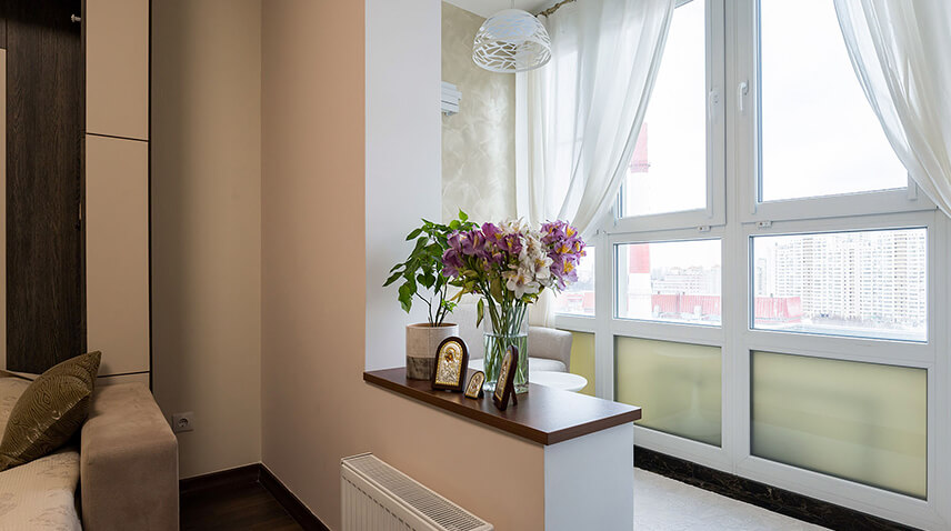 Если балкон, лоджия сделаны небольшими, каждый сантиметр пространства хочется применить с пользой. Но створки, которые распахиваются внутрь помещения, не позволяют этого добиться. Приходится выбирать: или прохлада, или комфорт. Но раздвижное остекление снимает проблему: створки сдвигаются по специальным направляющим, занимая минимум места. Можно устанавливать любую мебель и даже заставить цветами весь подоконник.