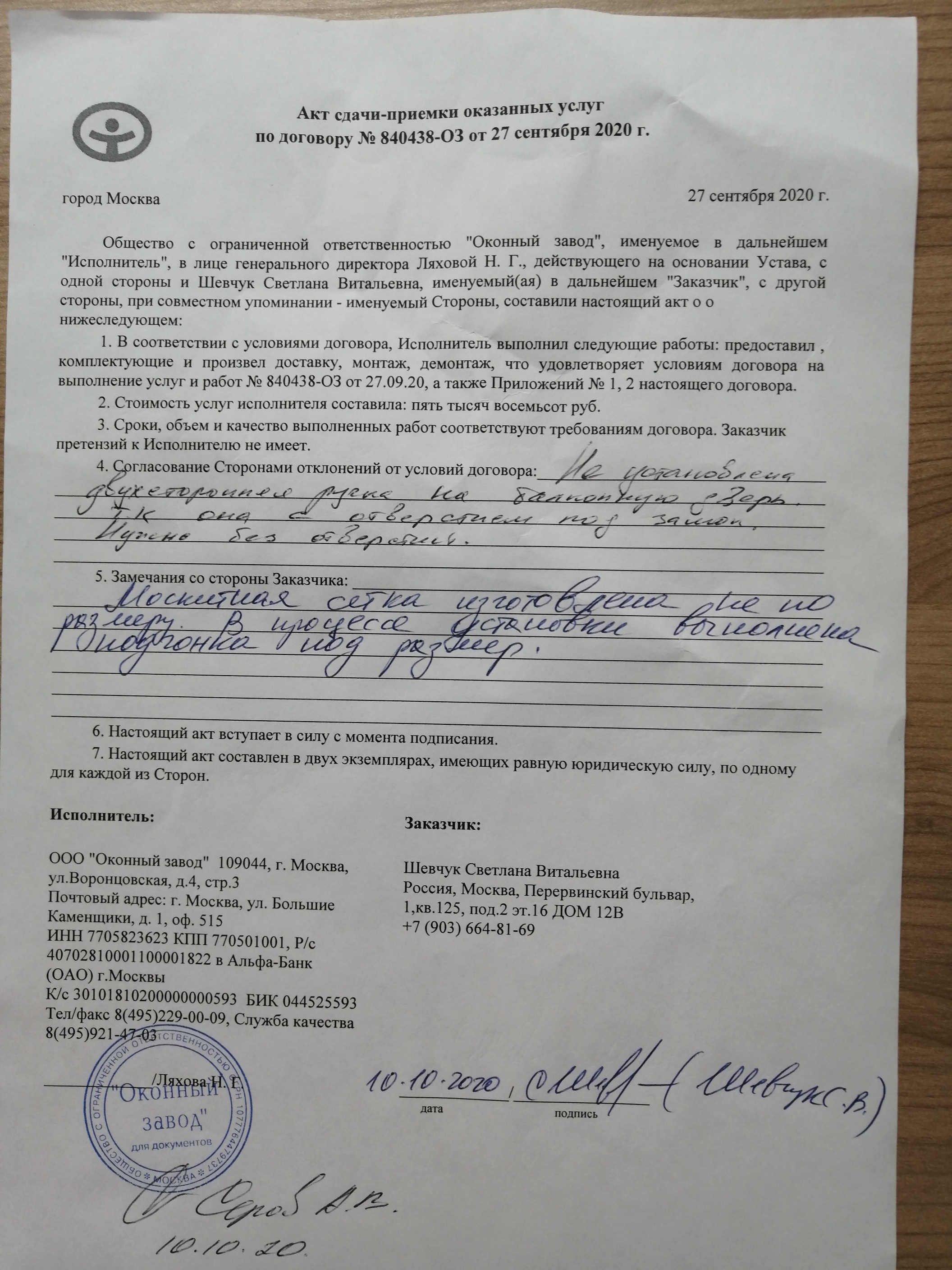 По Договору 840438-ОЗ от 27.09.2020. были заказаны москитная сетка и ручка для балконной двери. Сетка выполнена не по размеру, 3 раза привозили неподходящие ручки. Ручка до сих пор не установлена!